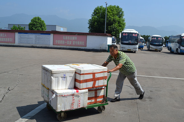 說話間,一輛班車緩緩駛?cè)胲囌尽T谙驴蛥^(qū)等候的江永貴和同班的胡瑞華快速地打開車輛行李倉?!耙患?、兩件、三件、四件……”江永貴一邊念著數(shù)字一邊熟練地搬著貨物,一件件貨物在他們手上快速頻繁地拿起、放下。雖然揮汗如雨,但規(guī)范操作程序卻絲毫不受影響:仔細核對貨號、件數(shù)、 到達站點、駕駛員簽名…… ,對精密電子設(shè)備、易碎物品、海鮮等 ,他們總是不忘給予特殊的“關(guān)照”。這看似簡單機械,沒有技術(shù)含量的工作,卻需要莫大的毅力和耐心。車艙狹小,為適應卸貨碼貨的需要,他們不停的變換姿勢,時而曲膝半蹲,時而探身彎腰,片刻,他們剛剛有點晾干的工作服又一次被汗水浸透了。