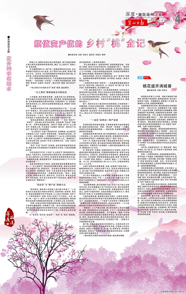 3月31日,《麗水日?qǐng)?bào)》第4版“花開四季看麗水”主題,整版刊登由至逸文化公司策劃執(zhí)行的仙渡云上桃花節(jié)活動(dòng)。自集團(tuán)與仙渡鄉(xiāng)簽訂戰(zhàn)略合作協(xié)議以來,至逸公司與仙渡鄉(xiāng)深入溝通,挖掘鄉(xiāng)村旅游資源,將依托當(dāng)?shù)仫L(fēng)土人情與非遺文化、紅色文化等,形成“桃花+”模式,推出各類具有地方特色的文旅產(chǎn)品。